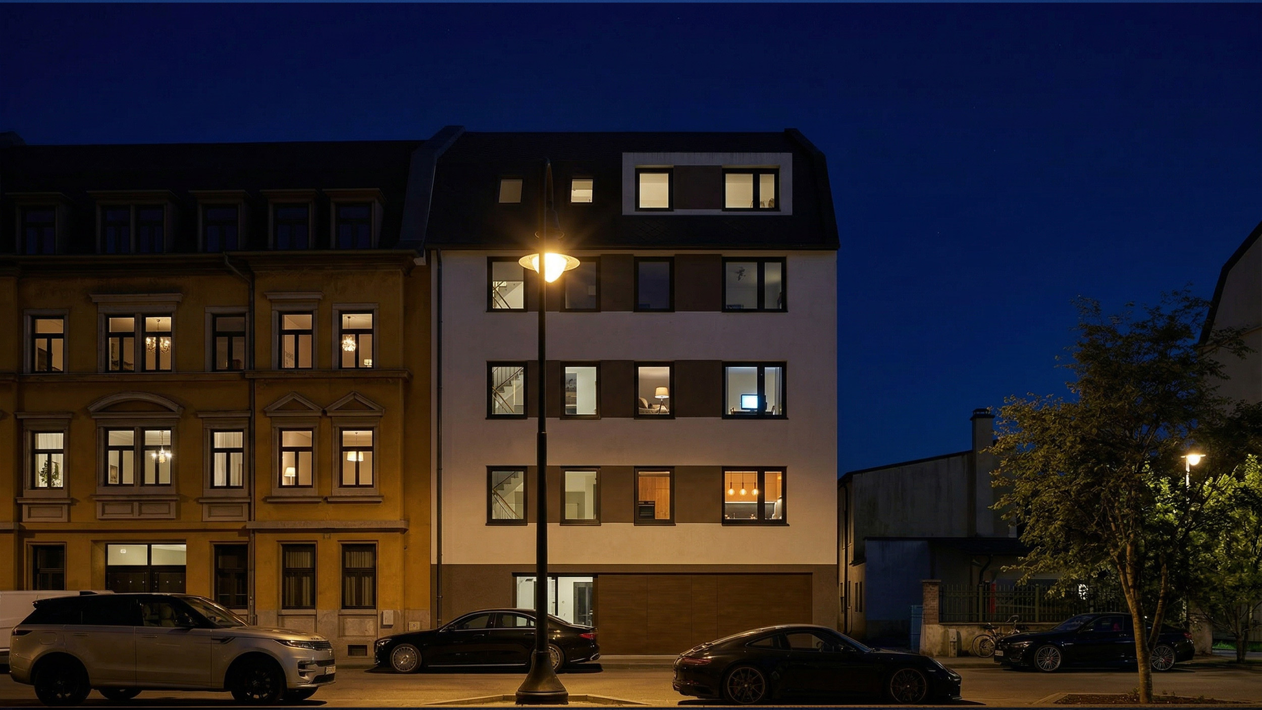 Im Dresdner Stadtteil Pieschen entsteht ein hochwertiges Wohnensemble aus zwei Baukörpern: ein moderner Neubau zur Straßenseite und ein ruhig gelegenes Stadthaus im begrünten Innenhof — insgesamt neun Wohneinheiten.